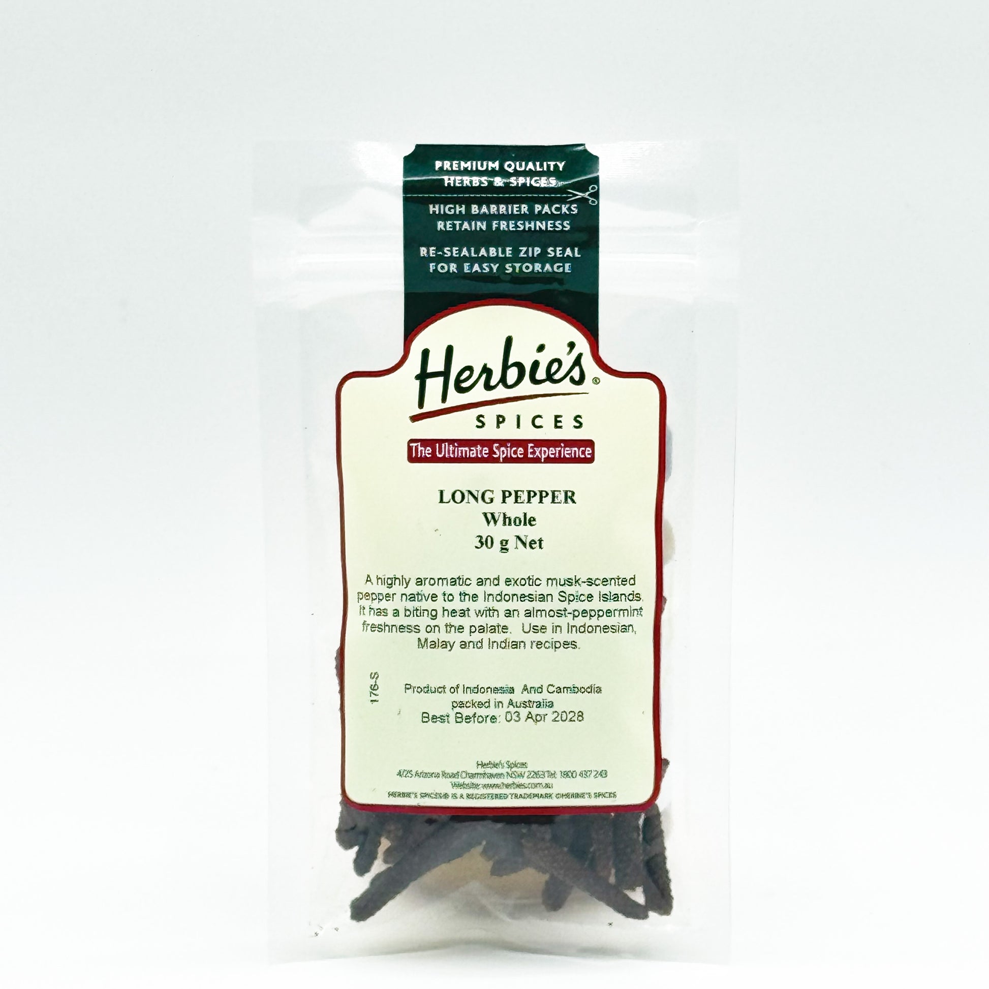 Native to Indonesia, Long Pepper looks like a short ratÕs tail about 3cm long. It grows on a small vine related to true pepper and cubeb pepper. The aroma is sweet, fragrant and musk-like and the flavour is similarly musky and peppery. Used in many exotic Asian dishes and clear soups. Long Pepper goes well with galangal, turmeric and kenchur in rich, thick curries.