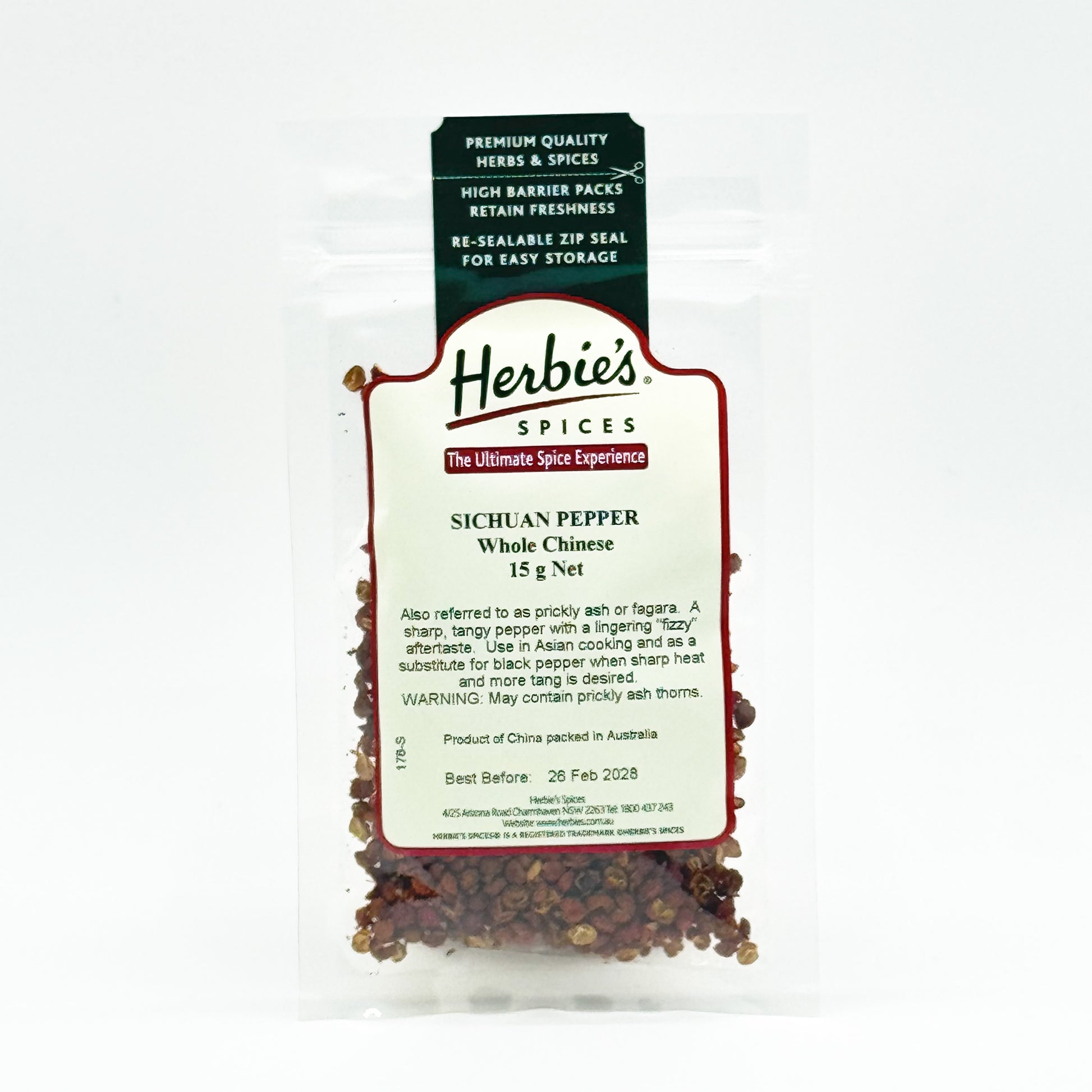 Not a true pepper but the dried, burst seed pods of a prickly ash tree. The taste is hot like pepper, lingering and somewhat ÔfizzyÕ on the tongue. It is used in many Asian recipes, especially stocks for making roast duck and pork, and is the pepper that must be used when making Salt & Pepper Squid. The black seeds within the seed pods are tasteless and gritty when ground. At HerbieÕs Spices we select the very highest quality that has been graded and cleaned, so you should never see any of these little black seeds. If you do come across one, just discard it.
